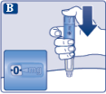 • Drücken Sie den Injektionsknopf und halten Sie ihn gedrückt. Beobachten Sie, wie die Dosisanzeige auf „0“ zurückkehrt. Die Ziffer „0“ muss auf Höhe der Dosismarkierung erscheinen. Dann können Sie ein Klicken hören oder fühlen. |