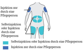 - Oberarm (Wenn eine Pflegeperson die Injektion durchführt, kann auch in die Außenseite des Oberarms injiziert werden.)