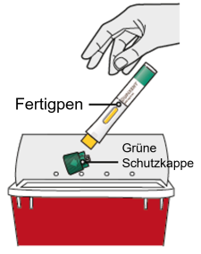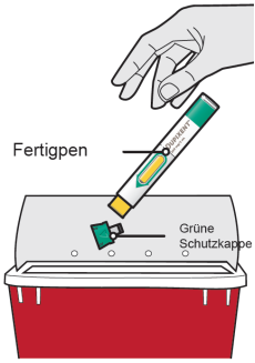 - Entsorgen Sie die Fertigpens (mitsamt der Nadel im Inneren) und die grünen Schutzkappen direkt nach der Anwendung in einem durchstichsicheren Behältnis.