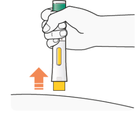 - Halten Sie den Fertigpen beim Platzieren der gelben Nadelabdeckung auf Ihrer Haut so, dass Sie das Sichtfenster sehen können.