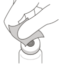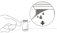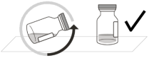 2 | Um sicherzustellen, dass sich die gesamte Flüssigkeit am Boden der Durchstechflasche absetzt, die Durchstechflasche nach der Entnahme aus der Packung aufrecht auf eine ebene Fläche stellen (für ca. 1 Minute) (siehe Abbildung B). Vorsichtig mit dem Finger gegen die Durchstechflasche klopfen (siehe Abbildung C), da Flüssigkeit oben an der Durchstechflasche haften kann. | ||