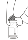 5 | Die Transfer-Filternadel unter aseptischen Bedingungen in das Zentrum des Septums der Durchstechflasche stechen (siehe Abbildung G), ganz hineindrücken und dann die Durchstechflasche leicht neigen, sodass die Nadel die Unterkante der Durchstechflasche berührt (siehe Abbildung H). | ||