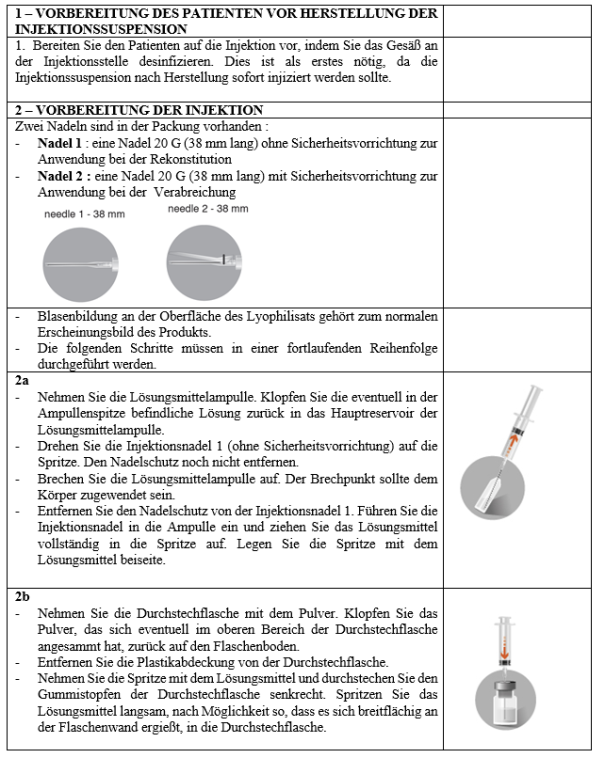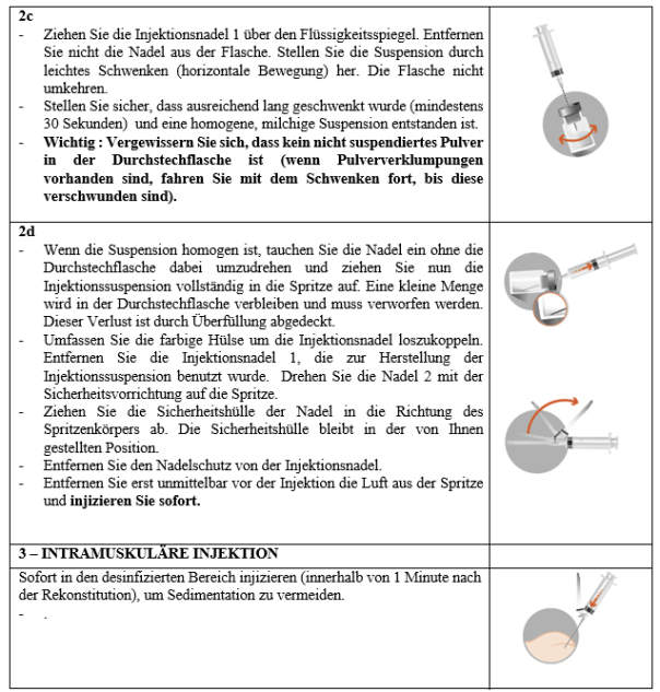 Eine Verpackung enthält eine Durchstechflasche mit Pulver, eine Ampulle mit Lösungsmittel, eine Spritze und zwei Injektionsnadeln für eine Injektion in die Muskulatur (intramuscular) mit lang andauernder Wirkung.