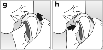 - Placez la buse dans l’une de vos narines - voir schéma g. Pointer légèrement l’extrémité de la buse vers le côté extérieur, loin de la cloison nasale centrale. Ceci permet de pulvériser le médicament dans la bonne partie du nez.