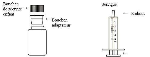 - Un bouchon adaptateur et deux seringues pour administration orale sont fournis.