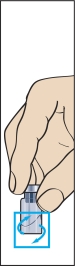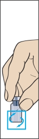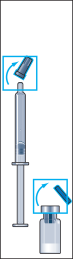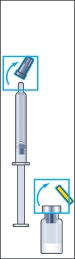 8. Prenez la seringue d’administration munie d’une aiguille préfixée et introduisez l’aiguille verticalement dans le centre du flacon. La seringue d’administration contient déjà une faible quantité d’air, qui doit être injectée dans le flacon au-dessus du liquide. Retournez le flacon et aspirez la dose prescrite de Menopur Ferring dans la seringue d’administration pour l’injection (figure 8).