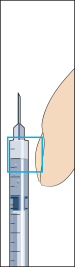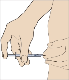 11. Pour l’injection, pincez votre peau pour produire un pli et insérez l’aiguille dans le pli en un mouvement rapide à un angle de 90 degrés par rapport au corps. Enfoncez le piston prudemment pour injecter la solution (figure 11), puis retirez la seringue d’administration.