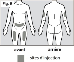 Les sites d'injection recommandés sont l'avant et le milieu des cuisses et la partie inférieure de l'abdomen, au-dessous du nombril, à l'exception de la zone de 5 cm qui entoure directement le nombril. (Voir Fig. B)