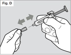 Tenez fermement le corps de la seringue d'une main et enlevez le capuchon de l'aiguille avec l'autre main. (Voir Fig. D) Si vous n'arrivez pas à enlever le capuchon de l'aiguille, vous devez demander l'aide d'un soignant ou contacter votre professionnel de santé.