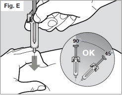 Insérez toute la longueur de l'aiguille dans la peau pincée avec un angle compris entre 45° et 90° avec un geste rapide et ferme. (Voir Fig. E).