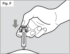 Injectez lentement la totalité du médicament en enfonçant délicatement et complètement le piston. (Voir Fig. F). Vous devez enfoncer complètement le piston pour vous assurer que vous vous administrez la totalité de la dose du médicament et que les clips d'activation sont complètement repoussés sur le côté. Si le piston n'est pas complètement enfoncé, le protège-aiguille pourrait ne pas recouvrir l'aiguille lors de son retrait. Si l'aiguille n'est pas recouverte, procédez avec précaution et déposez la seringue dans le conteneur pour objets pointus et tranchants afin d'éviter de vous blesser avec l'aiguille.