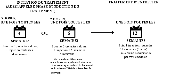 - Soit, vous pourrez être traité avec une injection à 6 semaines d’intervalle pour les deux premières doses. Votre médecin déterminera si une troisième injection est nécessaire 12 semaines après le début du traitement en fonction de l’état de votre oeil ou de vos yeux.