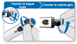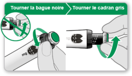 Remarque : si vous ne pouvez pas faire tourner la bague noire, appuyez sur le bouton injecteur bleu jusqu’à l’arrêt des clics. Essayez ensuite de régler à nouveau votre dosage. Veuillez noter que du liquide s’échappera de l’aiguille.