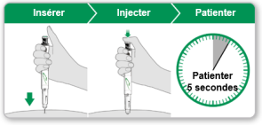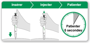 - Patientez 5 secondes pour vous assurer que la dose complète a été injectée. Continuez à appuyer légèrement sur le bouton injecteur vert pendant que vous comptez.