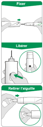 Remarque : si une goutte de liquide apparaît au niveau du site d’injection ou à l’extrémité de l’aiguille, essayez lors de votre prochaine injection d’appuyer plus longtemps sur le bouton injecteur vert avant de retirer l’aiguille de votre peau.