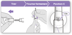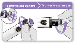 Remarque : si vous ne pouvez pas faire tourner la bague noire, appuyez sur le bouton injecteur violet jusqu’à l’arrêt des clics. Essayez ensuite de régler à nouveau votre dosage. Veuillez noter que du liquide s’échappera de l’aiguille.
