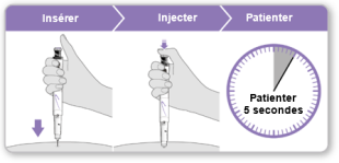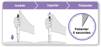 - Patientez au moins 5 secondes pour vous assurer que la dose complète a été injectée. Continuez à appuyer légèrement sur le bouton injecteur violet pendant que vous comptez.