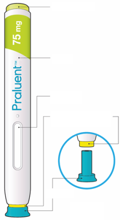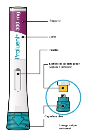 - Ce dispositif est un stylo pré-rempli jetable à usage unique. Il contient 300 mg de Praluent (alirocumab) dans 2 ml.