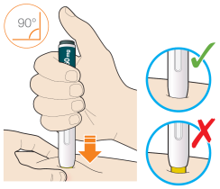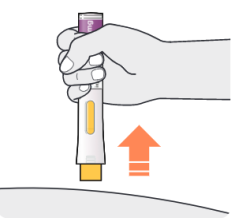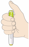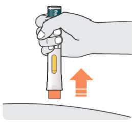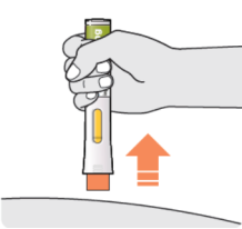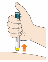- Appuyez le stylo droit contre votre peau jusqu’à ce que l’embout de sécurité jaune soit enfoncé complètement dans le stylo et maintenez-le enfoncé.
