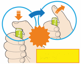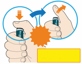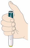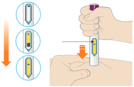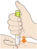- Appuyez directement le stylo contre votre peau jusqu’à ce que l’embout de sécurité jaune soit enfoncé complètement dans le stylo et maintenez-le enfoncé (voir image).