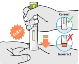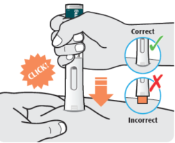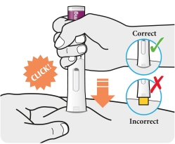 - Appuyez le stylo droit contre votre peau jusqu’à ce que l’embout de sécurité orange soit enfoncé complètement dans le stylo et maintenez-le enfoncé.