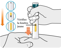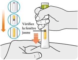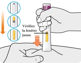- Lorsque vous placez l’embout de sécurité jaune contre votre peau, tenez le stylo de façon à voir la fenêtre.