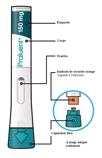 - Ce dispositif est un stylo pré-rempli jetable à usage unique. Il contient 150 mg de Praluent (alirocumab) dans 1 ml.