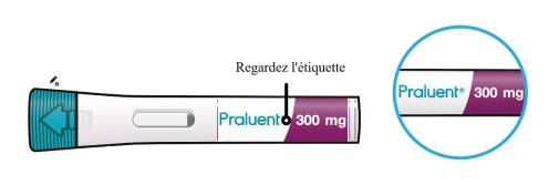 Injectez Praluent une fois toutes les 2 semaines pour des posologies de 75 mg et 150 mg ou une fois toutes les 4 semaines/mensuellement pour une posologie de 300 mg. Pour administrer la posologie de 300 mg, procédez à une injection de 300 mg ou à deux injections de 150 mg à la suite sur deux sites d’injections différents.