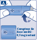 Seuls le compteur de dose et l’indicateur de dose montreront que la dose de 0,5 mg a été sélectionnée. | ||