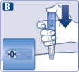 • Appuyez sur le bouton de dose et maintenez-le enfoncé. Regardez le compteur de dose revenir à « 0 ». Le « 0 » doit être aligné avec l’indicateur de dose. Vous pourrez alors entendre ou sentir un clic. |