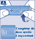 Seuls le compteur de dose et l’indicateur de dose montreront que la dose de 1 mg a été sélectionnée. | ||