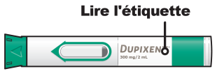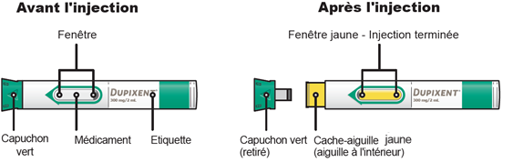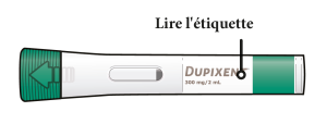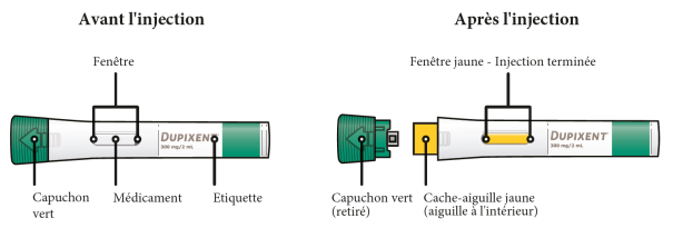 Ce dispositif est un stylo prérempli à usage unique. Il contient 300 mg de Dupixent à administrer par injection sous la peau (injection sous-cutanée).