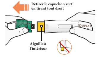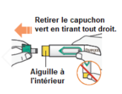 - Ne retirez pas le capuchon vert avant d’être prêt(e) pour l’injection.