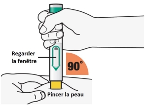- En plaçant le dispositif de protection de l’aiguille jaune sur votre peau, tenez le stylo prérempli afin de voir la fenêtre.