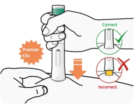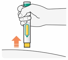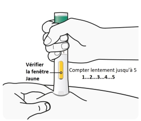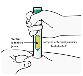 Appuyez fermement le stylo prérempli contre votre peau jusqu’à ne plus voir le dispositif de protection de l’aiguille jaune, et maintenez enfoncé.