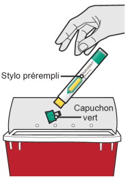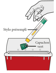 - Éliminez les stylos préremplis (aiguille à l’intérieur) et les capuchons verts immédiatement après utilisation, dans un récipient résistant à la perforation.
