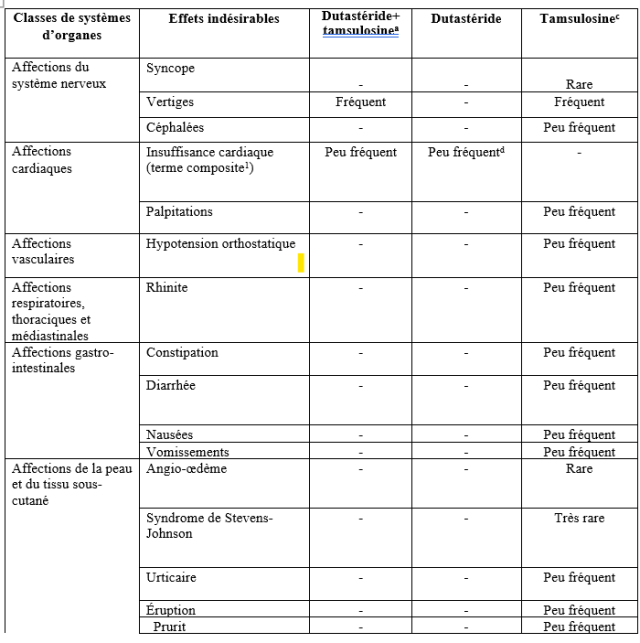 En outre, les effets indésirables de la tamsulosine mentionnés ci-dessous sont basés sur des informations disponibles dans le domaine public. Les fréquences des effets indésirables peuvent augmenter lors de l’utilisation du traitement combiné.
