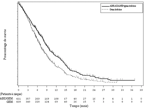 Les effets indésirables ont été évalués chez 421 patients présentant un cancer du pancréas métastatique qui ont été traités par Abraxane en association avec la gemcitabine (Abraxane 125 mg/m2 en association avec la gemcitabine à la dose de 1 000 mg/m2, administrés les jours 1, 8 et 15 de chaque cycle de 28 jours) et 402 patients recevant la gemcitabine en monothérapie en traitement systémique de première ligne d’un adénocarcinome du pancréas métastatique(Abraxane/gemcitabine).
