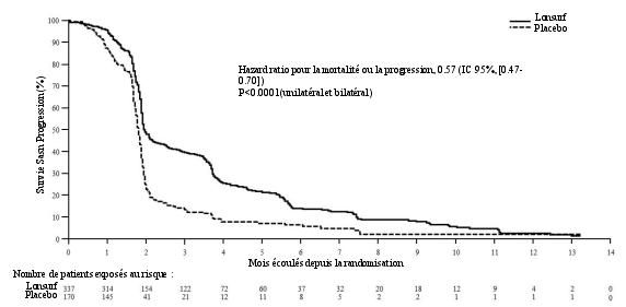 Lonsurf est indiqué en monothérapie dans le traitement de patients adultes atteints d’un cancer gastrique métastatique (CGm) incluant l’adénocarcinome de la jonction gastro-œsophagienne ayant été précédemment traités avec au moins deux protocoles de traitement systémique au stade avancé de la maladie (voir rubrique 5.1).