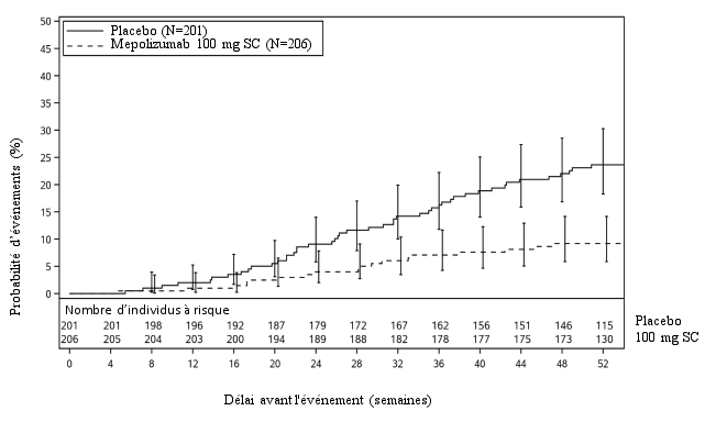 Dans l’étude de 52 semaines contrôlée contre placebo, 2 patients (<1%) ont rapporté des réactions allergiques (hypersensibilité de type I) systémiques dans le groupe recevant 100 mg de mépolizumab et aucun patient dans le groupe placebo. Aucun patient n’a rapporté d'autres réactions systémiques dans le groupe recevant 100 mg de mépolizumab et 1 patient (<1%) dans le groupe placebo.