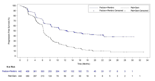 Dans les études cliniques de l’enfortumab vedotin en association avec le pembrolizumab, une pneumopathie inflammatoire/PID est survenue chez 58 patients (10,3 %) des 564 patients. Une pneumopathie inflammatoire/PID sévère (grade 3 ou 4) est survenue chez 20 patients (grade 3 : 3,0 %, grade 4 : 0,5 %). Une pneumopathie inflammatoire/PID a entraîné l’arrêt de l’enfortumab vedotin chez 2,1 % des patients. Deux patients ont présenté un événement de pneumopathie inflammatoire/PID d’issue fatale. Le délai médian de survenue d'une pneumopathie inflammatoire/PID, quel que soit le grade, était de 4 mois (intervalle : 0,3 à 26,2 mois).