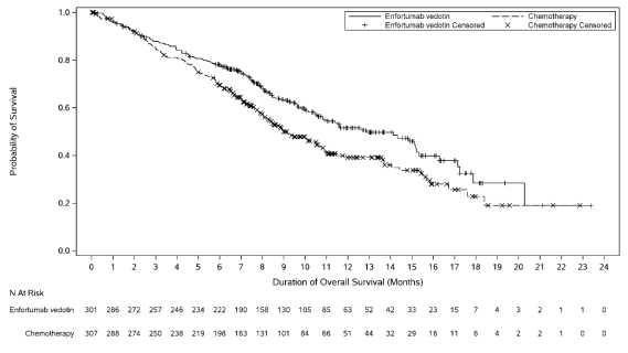 Les effets indésirables graves les plus fréquents (≥ 2 %) ont été la diarrhée (2,1 %) et l'hyperglycémie (2,1 %). Vingt-et-un pour cent des patients ont arrêté définitivement l’enfortumab vedotin en raison d’effets indésirables ; l’effet indésirable le plus fréquent (≥ 2 %) entraînant un arrêt définitif du traitement était la neuropathie périphérique sensitive (4,8 %). Des effets indésirables entraînant une interruption du traitement sont survenus chez 62 % des patients ; les effets indésirables les plus fréquents (≥ 2 %) entraînant une interruption du traitement étaient la neuropathie périphérique sensitive (14,8 %), la fatigue (7,4 %), l’éruption maculo-papuleuse (4 %), l’augmentation du taux d’aspartate aminotransférase (3,4 %), l’augmentation du taux d’alanine aminotransférase (3,2 %), l’anémie (3,2 %), l’hyperglycémie (3,2 %), la diminution du nombre de neutrophiles (3 %), la diarrhée (2,8 %), l’éruption cutanée (2,4 %) et la neuropathie périphérique motrice (2,1 %). Trente-huit pour cent des patients ont présenté un effet indésirable nécessitant une réduction de la dose ; les effets indésirables les plus fréquents (≥ 2 %) entraînant une réduction de la dose étaient la neuropathie périphérique sensitive (10,3 %), la fatigue (5,3 %), l’éruption maculo-papuleuse (4,2 %) et la diminution de l’appétit (2,1 %).