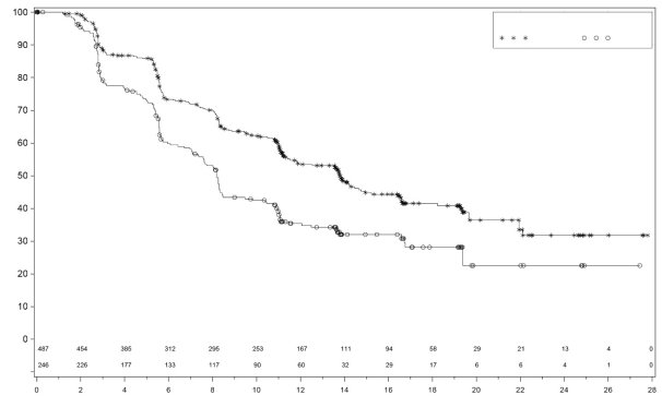 Les effets indésirables graves les plus fréquents > 1 % (fréquence des effets apparus sous traitement) ont été : thrombopénie et anémie.