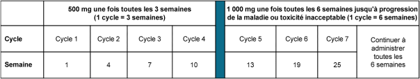 | 1000 mg une fois toutes les 6 semaines en monothérapie jusqu’à progression de la maladie ou toxicité inacceptable , ou pour une durée maximale allant jusqu’à 3 ans (1 Cycle = 6 semaines) | ||||||||