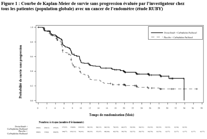 La sécurité du dostarlimab a été évaluée chez 605 patients atteintes d’un cancer de l’endomètre ou d’autres tumeurs solides avancées, qui ont reçu du dostarlimab en monothérapie dans le cadre de l’étude GARNET, incluant 153 patientes qui présentaient un cancer de l’endomètre dMMR/MSI-H avancé ou récidivant. Les patients ont reçu 500 mg de dostarlimab toutes les 3 semaines pour les 4 premiers cycles, puis 1 000 mg toutes les 6 semaines pour tous les cycles suivants.