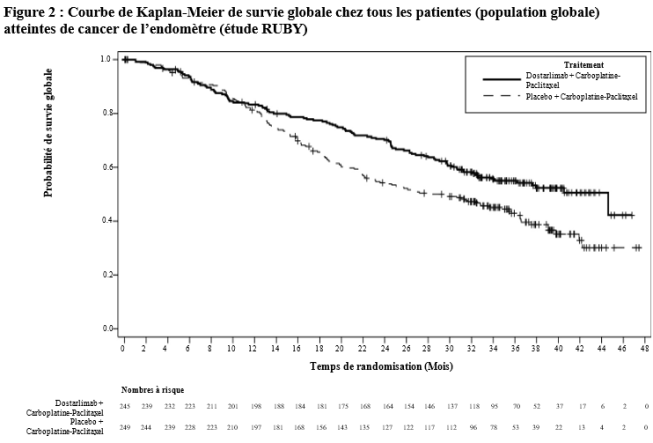 Dans l’étude GARNET, les anticorps anti-médicaments ont été dosés chez 315 patients ayant reçu dostarlimab ; l’incidence des anticorps anti-médicaments apparus sous traitement par dostarlimab était de 2,5 %. Des anticorps neutralisants ont été détectés chez 1,3 % des patientes. La co-administration avec le carboplatine et le paclitaxel n’a pas affecté l’immunogénicité du dostarlimab. Dans l’étude RUBY, parmi les 225 patientes qui étaient traitées par le dostarlimab en association avec le carboplatine et le paclitaxel et dont la présence d’anticorps anti-médicaments était évaluable, il n’y a eu aucune incidence d’anticorps anti-médicaments apparus sous traitement par dostarlimab ou d’anticorps neutralisants apparus sous traitement.
