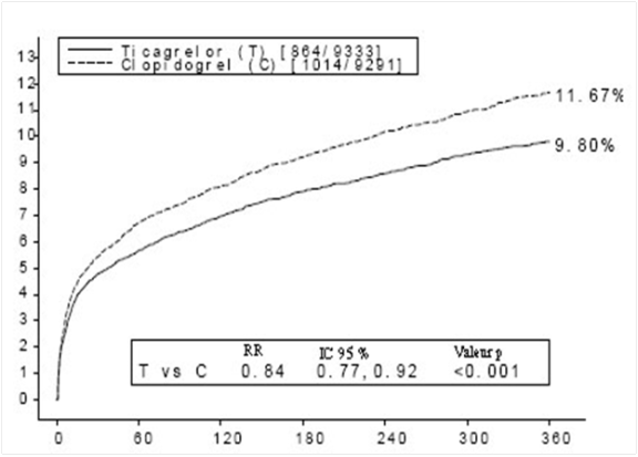 Il y a plus de saignements intracrâniens non reliés à une procédure dans le groupe ticagrélor (n=27 saignements chez 26 patients, 0,3 %) que dans le groupe clopidogrel (n=14 saignements, 0,2 %), avec onze saignements fatals sous ticagrélor contre un sous clopidogrel. Il n’y pas eu de différence sur la totalité des hémorragies fatales.