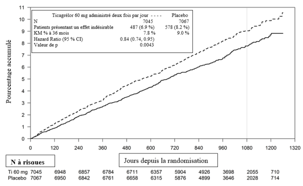 | Ticagrélor 60 mg deux fois par jour + AAS | AAS en monothérapie N = 6996 |