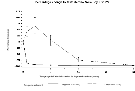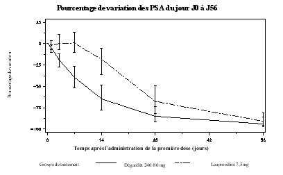 La réponse thérapeutique au dégarélix est évaluée par l’examen clinique et les dosages sanguins de l’antigène spécifique de la prostate (PSA). Les études cliniques ont montré que l’inhibition de la sécrétion de testostérone (T) débute immédiatement après l’administration de la dose d’initiation du traitement. Un taux sérique de testostérone correspondant à la castration médicale (T ≤ 0,5 ng/ml) est atteint trois jours après chez 96% des patients et un mois après, chez 100% des patients. Il a été montré qu’après 1 an de traitement à la dose d’entretien, la suppression de la sécrétion de testostérone (T ≤ 0,5 ng/ml) se maintenait chez 97% des patients.