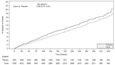 Dans une étude du devenir de la fonction rénale à long terme chez des patients adultes atteints de diabète de type 2 et de maladie rénale chronique, l’incidence des événements liés à la fonction rénale était élevée dans les deux groupes, mais moins élevée dans le groupe canagliflozine (5,71 événements pour 100 patients-années) que dans le groupe placebo (7,91 événements pour 100 patients-années). Les événements graves et sévères liés à la fonction rénale étaient également moins fréquents dans le groupe canagliflozine que dans le groupe placebo. Les taux d’incidence des événements liés à la fonction rénale étaient inférieurs avec la canagliflozine par rapport au placebo dans les trois strates de DFGe ; le taux d’incidence le plus élevé des événements liés à la fonction rénale a été observé dans la strate où le DFGe est compris entre 30 et < 45 mL/min/1,73 m2 (9,47 contre 12,80 événements pour 100 patients-années respectivement pour la canagliflozine et le placebo).